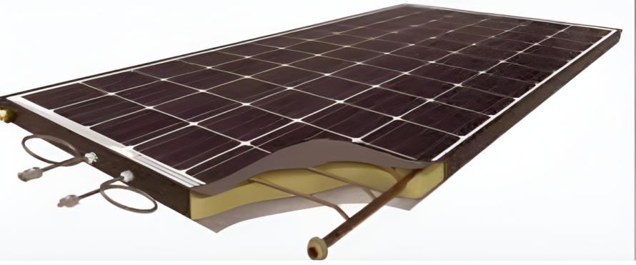 The integrated water collector heats water in a similar way to traditional solar thermal systems, while the photovoltaic cells on the same surface generate electricity.